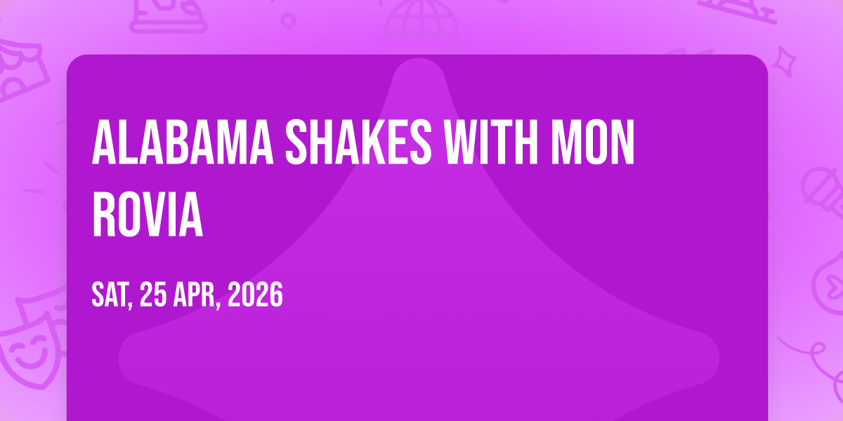 📍 Location: 35.7738, -78.6431🎉 Welcome to Alabama Shakes with Mon Rovia, where dreams come alive and possibilities are endless! 🏛️ Join us at Red Hat Amphitheater in the heart of Raleigh, NC for an event that defies expectations. 📅 On April 25th, 2026 at 11:00 PM, be part of something truly extraordinary as we bring together innovation, entertainment, and pure magic. ✨ Every aspect has been carefully designed to ensure an unforgettable experience for all our guests. Whether you're seeking adventure, inspiration, or simply a break from the ordinary, this event promises to deliver beyond your wildest dreams. 🎊 Prepare for a journey into the extraordinary!