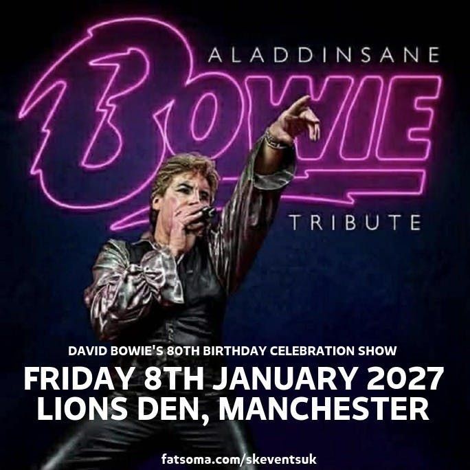 Join us at Lions Den, Manchester on David Bowie's 80th Birthday where the fantastic Aladdinsane will be taking us through the glorious career of David Bowie with their set of classic hits, fan favourites and loads more!Tickets onsale Friday 23rd January at 10.00am via - Fatsoma.com/skeventsukAladdinsane, The Sound & Vision of Bowie, widely acclaimed as the best Bowie tribute in the UK.They have played theatres, festivals and venues throughout the UK for the many years, with Paul Henderson performing as David Bowie, with audiences commenting how eerily close his voice, moves and mannerisms are to that as Bowie.