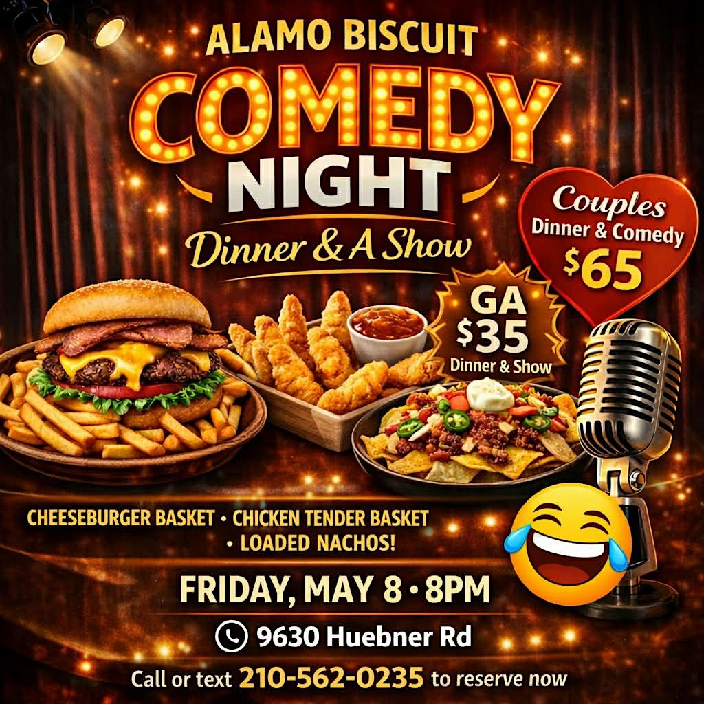 Get ready for a night of great food and big laughs at Alamo Biscuit Comedy Night: Dinner & A Show 🍔😂