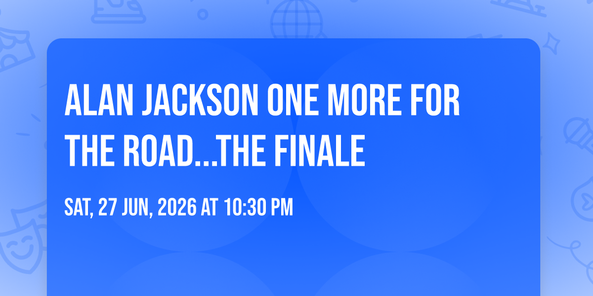 📍 Location: 36.1661, -86.7721✨ Experience the magic of Alan Jackson One More for the Road...The Finale, where moments become memories that last a lifetime! 🏛️ The iconic Nissan Stadium in Nashville, TN sets the perfect stage for an unforgettable celebration on June 27th, 2026 at 10:30 PM. 🌟 It's been a curated experience that brings together the best of entertainment and innovation, creating an atmosphere of wonder and excitement. From the moment you arrive, you'll be immersed in a world where the ordinary transforms into the extraordinary. 🎊 Book early to secure your place in what promises to be an event that will be talked about for years to come!