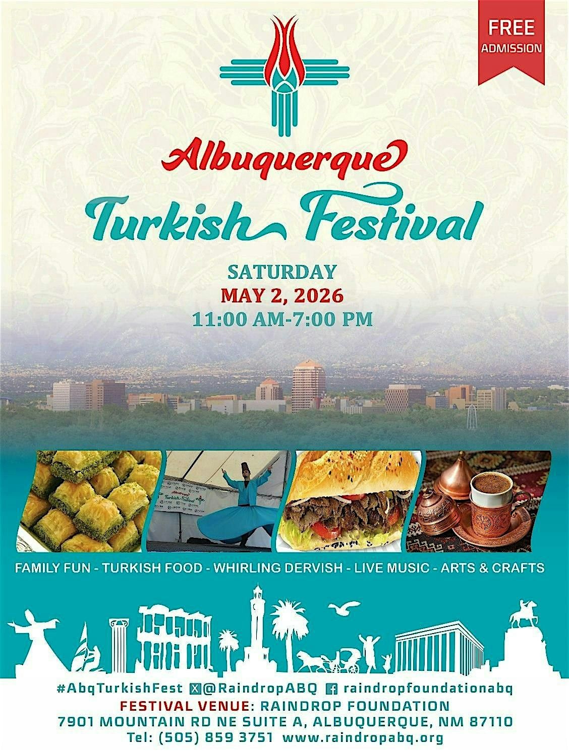 This year's Albuquerque Turkish Festival will be on Saturday, May 2nd, 2026 anytime between 11:00 AM and 7:00 PM at Raindrop Foundation Turkish Cultural Center (7901 Mountain Rd. NE Albuquerque, NM 87110).