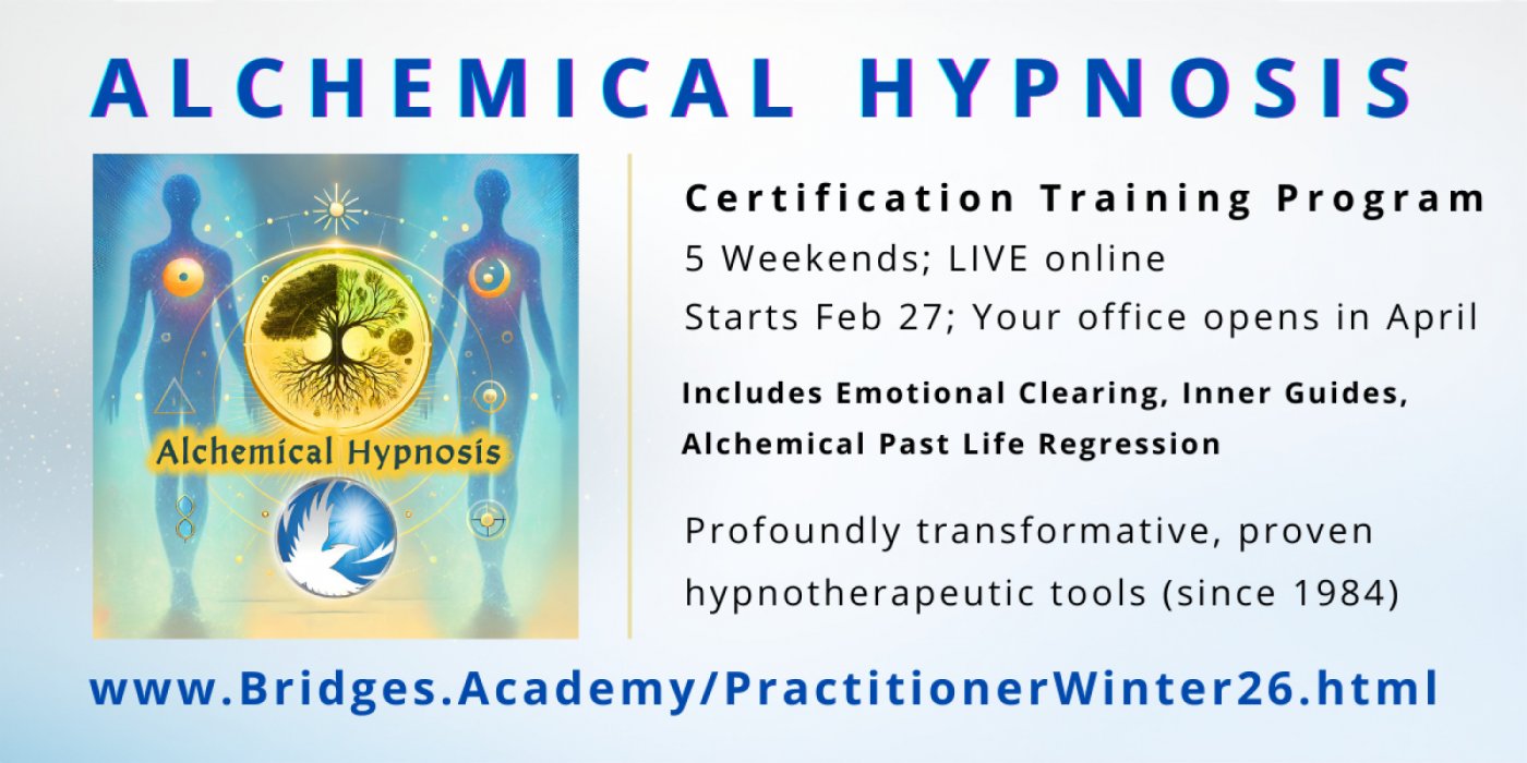 You can help create miracles of transformation with Alchemical Hypnosis! Join the online training program that starts at end of February, and you can begin serving clients at the end of April. It's 5 weekends of interactive experiential training, LIVE on Zoom, and you receive a comprehensive training workbook, too. Time: 9am to 5pm Pacific each day. (15 days total)
