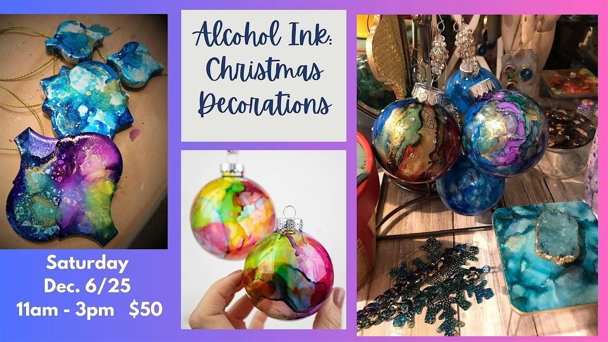 The decorations are a wide variety of shapes and sizes: glass white and clear balls in small and large, bells, sublimation tiles, icicles, deer, and a few surprises as well.This class will be fast-paced and enjoyable for all creatives regardless of skill level or age! In the end, you will be taking home some lovely decorations that you've created PLUS the knowledge of this wild and unpredictable ink medium. There is an endless supply of glitter and bling to decorate your items; foils, metallics, fake snow, jewels.....etc.