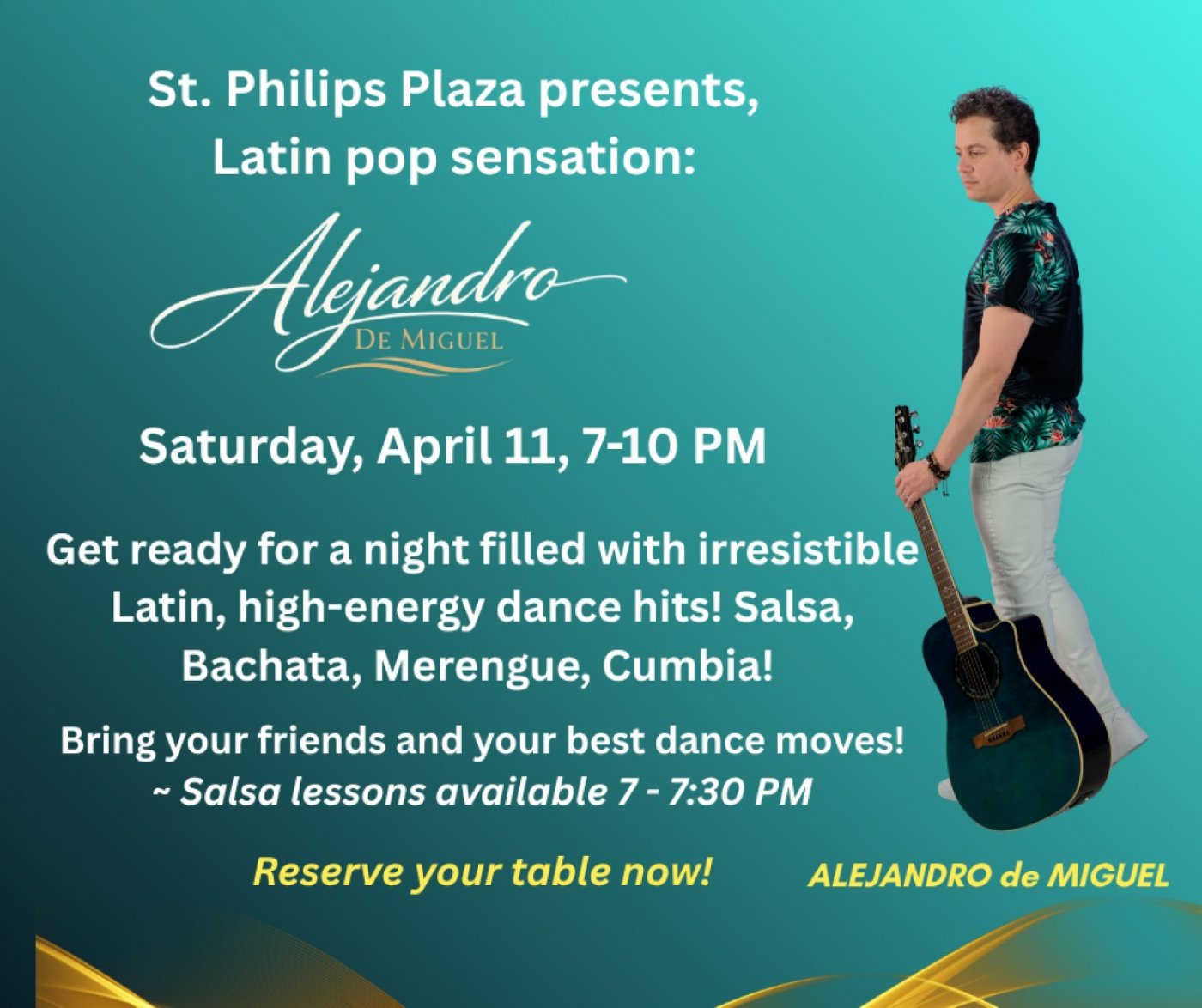 Latin pop sensation ALEJANDRO DE MIGUEL will take the stage at St Philips Plaza. Get ready for a night filled with irresistible, high energy Latin hits, Salsa, Bachata, Merengue, Cumbia.