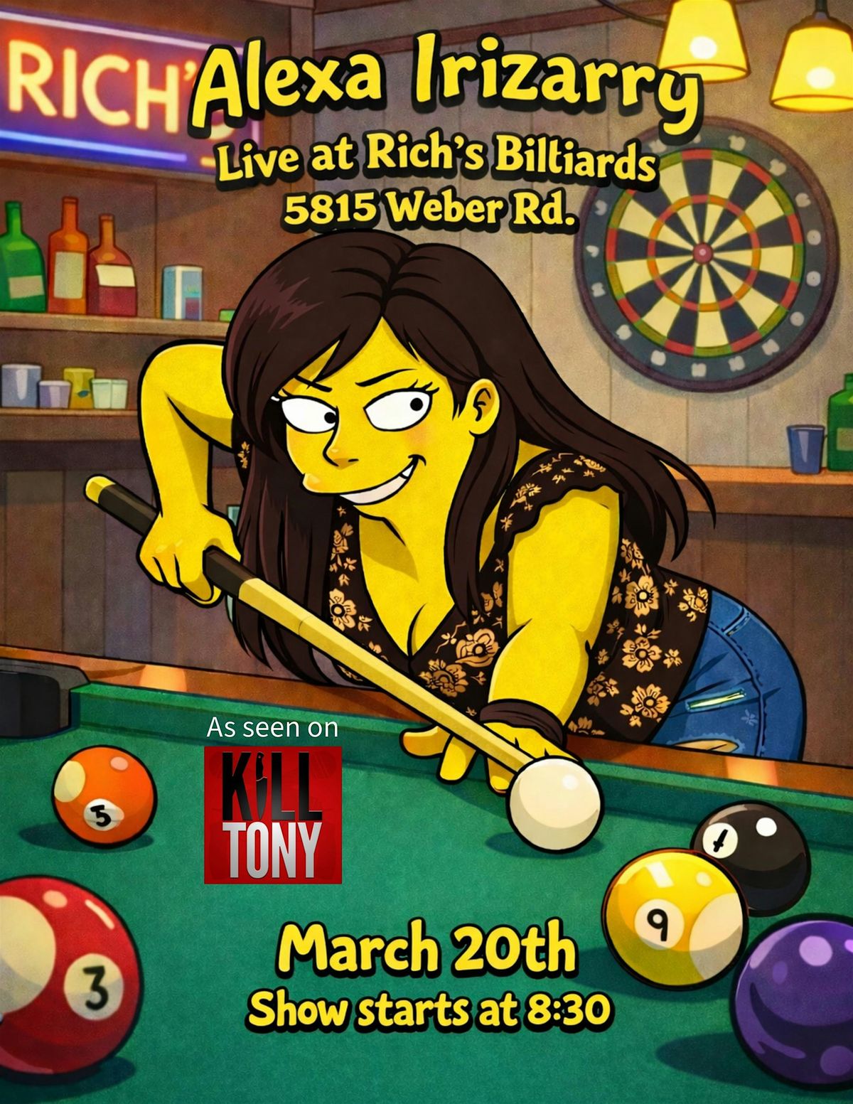 Get ready for a night of sharp jokes and big laughs as Alexa Irizarry takes the stage live at Rich’s Billiards. Known for her bold, quick-witted comedy and standout appearance on K*ll Tony, Alexa brings her unique voice and fearless humor to an intimate, laid-back setting where anything can happen.