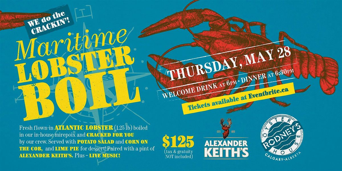 Your ticket includes a welcome pint of Keith’s, 1.25lb lobster flown in live from Misty Harbor New Brunswick, Corn on the Cob, Potato Salad and Lime Pie for dessert. Enjoy live music, new friends and messy hands!