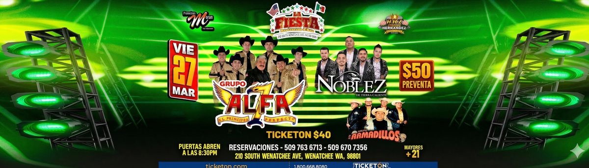Don't miss ALFA 7-NOBLEZ Y ARMADILLOS happening at La Fiesta Restaurant & bar , Wenatchee, WA, United States on 2026-03-27T20:30:00-08:00. A great evening with good music and a laid-back atmosphere awaits you. Invite your friends for a night out! **Event Details:** * **Location:** La Fiesta Restaurant & bar , Wenatchee, WA, United States Claim your ticket to be at the forefront of exciting innovation. #ALFA7-NOBLEZYARMADILLOS #event #exciting #WenatcheeEvents #WAEvents