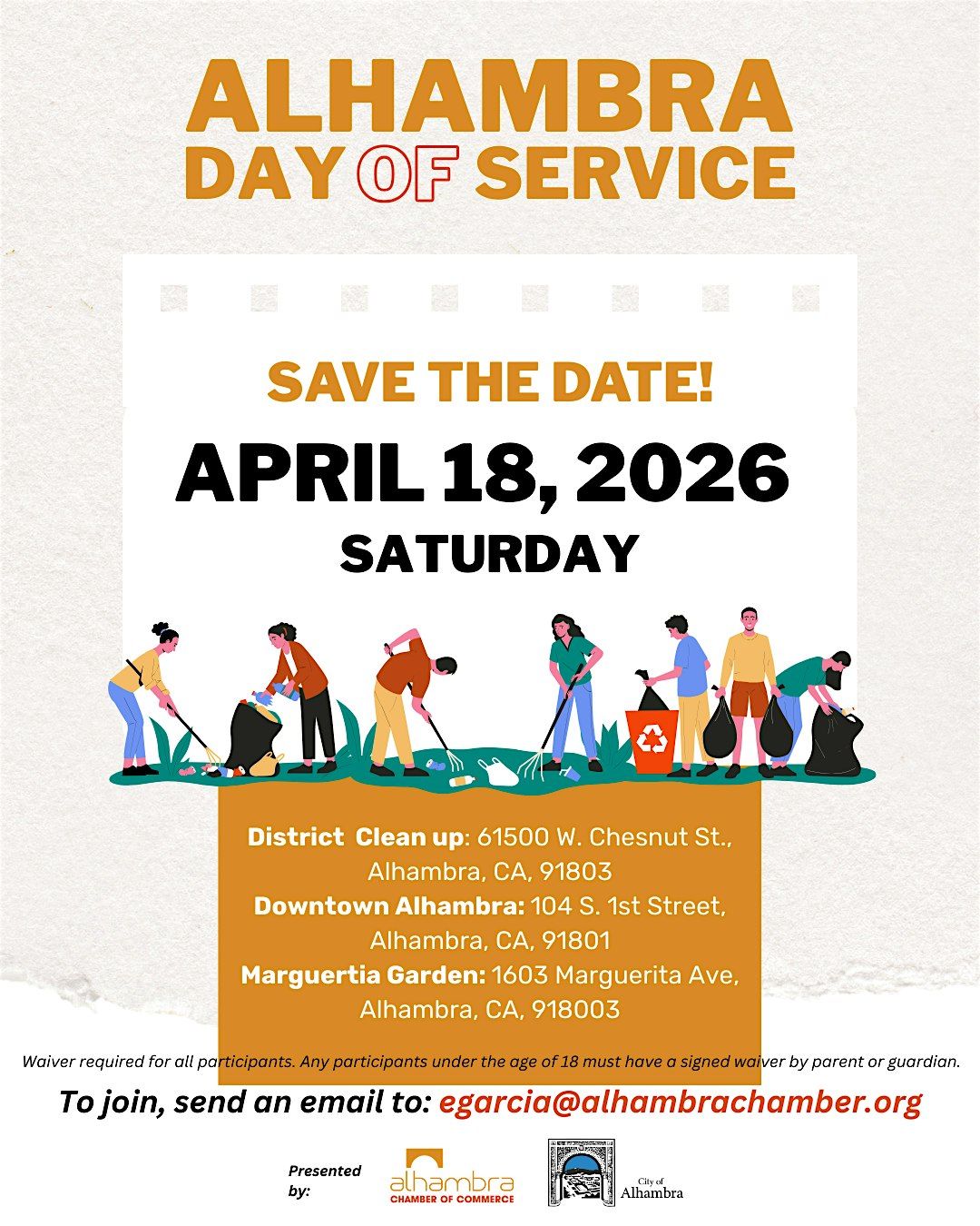 The Alhambra Chamber of Commerce Nonprofit Council has been working on the Alhambra Day of Service that is set to take place on Saturday, April 18, 2026, 8:00AM - 12:00PM. This day of service will consist of a variety of projects around the City where community members can join in and volunteer to beautify the community and other initiatives. Below is a list of projects and locations where volunteers can sign up and choose the project they would like to be involved in.