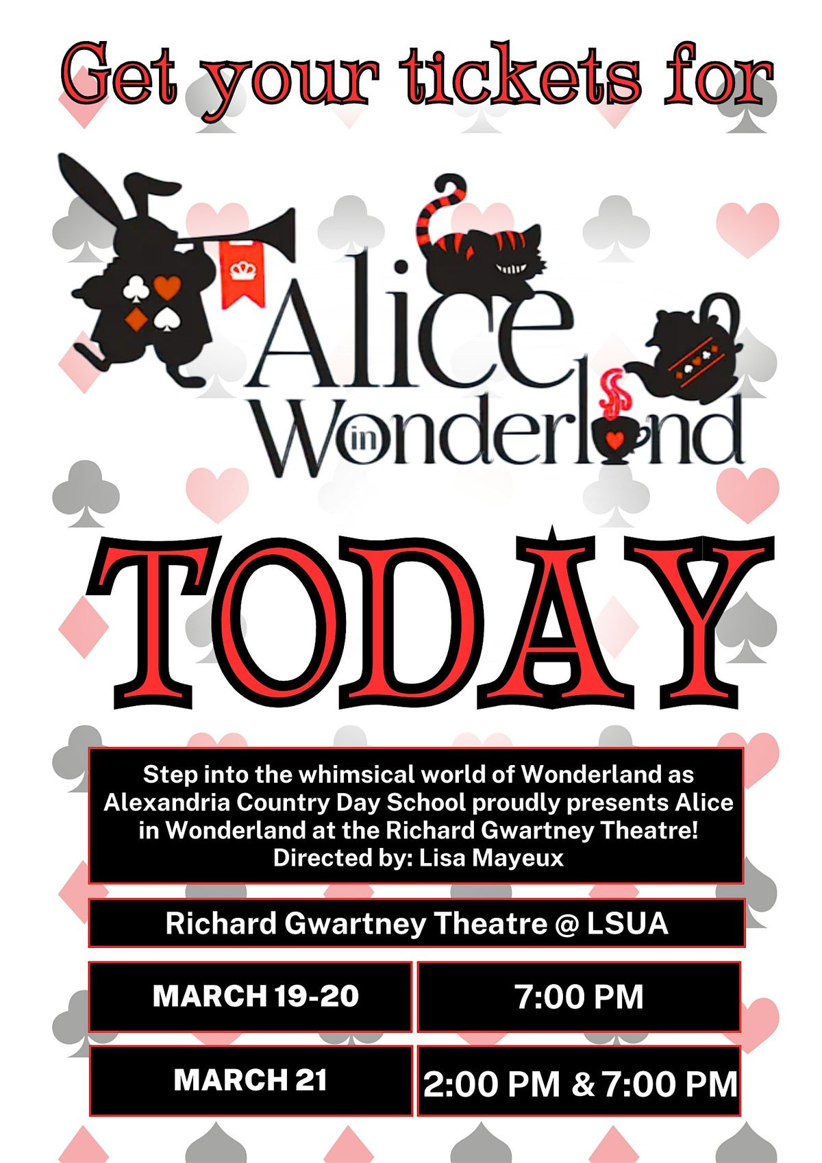 Alexandria Country Day School Presents Alice in Wonderland. *Brennan Chenevert on Thurs & Sat @ 7. *Bayleigh Cataldie Friday @ 7 & Sat @ 2.