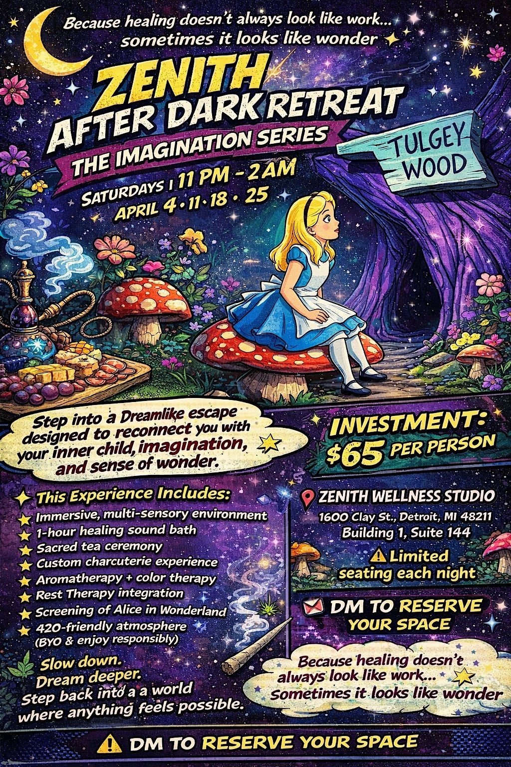 🌙✨ ZENITH AFTER DARK RETREAT: THE IMAGINATION SERIES ✨🌙 Saturdays | 11 PM – 2 AM April 4 • 11 • 18 • 25 Step into a dreamlike escape designed to reconnect you with your inner child, imagination, and sense of wonder. This April, Zenith transforms into a whimsical sanctuary where rest meets creativity — inviting you to soften, explore, and remember the magic within your own story. Inspired by the spirit of Alice in Wonderland, this After Dark Retreat is a journey into curiosity, play, and limitless imagination. ✨ This Experience Includes: • Immersive, multi-sensory environment • 1-hour healing sound bath • Sacred tea ceremony • Custom charcuterie experience • Aromatherapy + color therapy • Rest Therapy integration • Screening of Alice in Wonderland • 420-friendly atmosphere (bring your own & enjoy responsibly) 🌿 This is your invitation to: Slow down. Dream deeper. And step back into a world where anything feels possible. 💫 Investment: $65 per person 📍 Zenith Wellness Studio 1600 Clay St., Detroit, MI 48211 Building 1, Suite 144 ⚠️ Limited seating each night 💌 DM to reserve your space Because healing doesn’t always look like work… sometimes it looks like wonder ✨