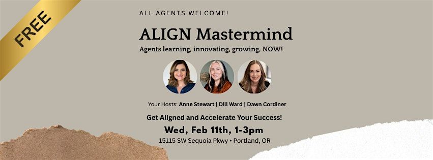 The ALIGN Mastermind is a collaborative, brokerage-agnostic session designed for real estate professionals who are ready to trade generic advice for proven, market-tested strategies. Led by Anne Stewart, Dill Ward, & Dawn Cordiner, and featuring insights from industry leaders, this mastermind focuses on the specific innovations and growth tactics currently driving results in the field. You will gain direct access to a community of high-achieving peers committed to elevating their business and their craft.