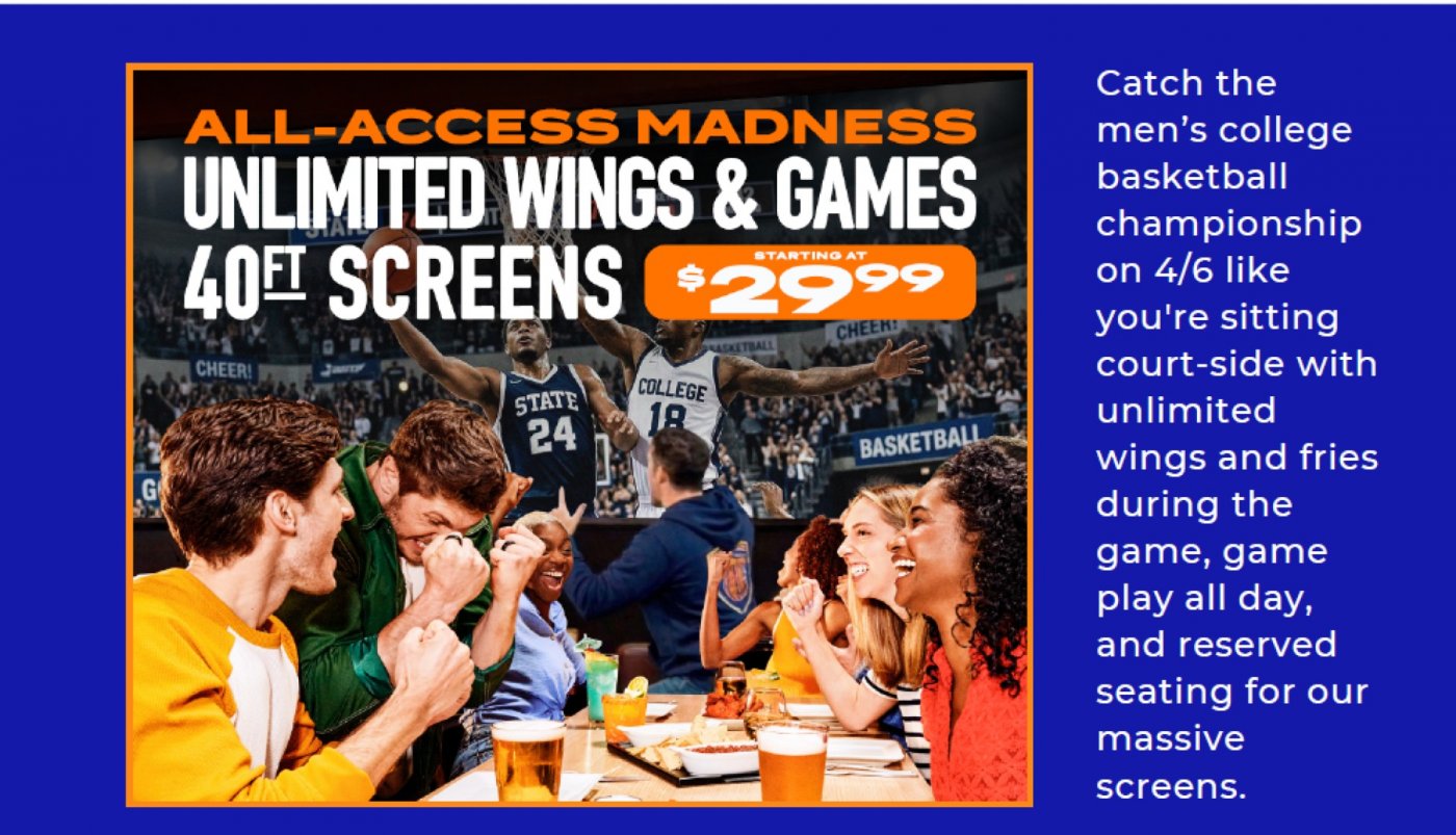 PROMOTIONAL. Limited time only. Men’s College Basketball Championship Game Ticketed Experience. Offer valid 4/6/26 only. Starting at $29.99, receive reserved seating access, All You Can Eat Wings and Fries during the game, and unlimited game play all day. Tickets must be purchased in advance through FEVER up until 1:00 p.m. eastern/12 p.m. central/10a.m. pacific on 4/6/26. Only ticketed guests will be admitted into the reserved event area. All You Can Eat Wings and Fries valid one per person, per seating, on premise. Get traditional and boneless wings with Classic Buffalo, Honey BBQ, Lemon Pepper, or No Sauce. First individual order includes 8 traditional or boneless wings and side of ranch. Reorders include 6 traditional or boneless wings, and fries. One choice of sauce per order. Cannot mix traditional and boneless in the same order. No take home bags. Participants eligible for various in select game live moments and surprise activations, to be determined by store. Offer not available for walk-in guests. Not to be combined with other offers. Available in store only. Dine in only. Excludes human crane, VR and redemption games. Promotion may be subject to revision or rescission at any time. Prices may vary by location. Tax and gratuity not included. Subject to availability. Valid at participating locations only. Store participation may vary. Not available with any other promotion. Not available in Canada and Puerto Rico locations. Other restrictions may apply. Void where prohibited. See store for details.