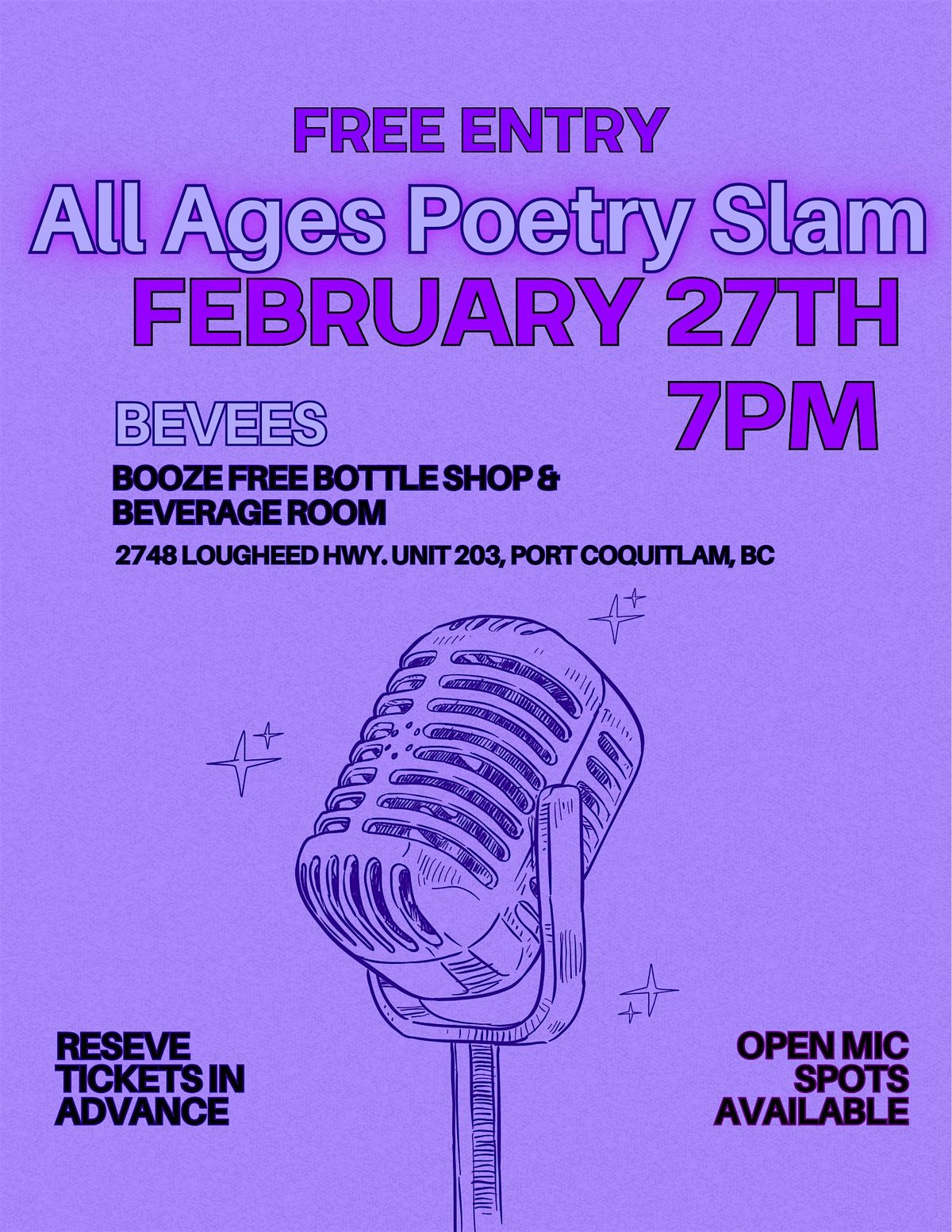 Come join us for a night of creative expression at Bevees Booze-Free Bottle Shop & Beverage Room! Whether you're a seasoned poet or a poetry newcommer, this event is open to all ages and all levels of experience. Share your original poems, stories, or even song lyrics in a supportive and welcoming environment. Don't miss out on this opportunity to win cash prizes, show your work or support local arts. See you there!