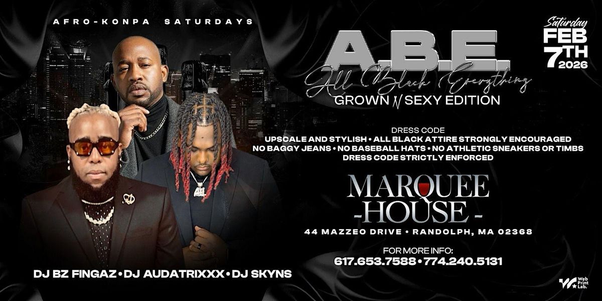 ALL BLACK EVERYTHING ** GROWN & SEXY, Saturday February 7th at Marquee House 44 Mazzeo DR, Randolph Ma, 10pm-2am. DJ BZ FINGAZ II DJ AUDATRIXX II DJ SKYN. DRESS CODE Upscale and Stylish, All Black Attire Strongly Encouraged, No Baggy Jeans, No Baseball ball Hats, No Athletic Sneakers or Timbs,