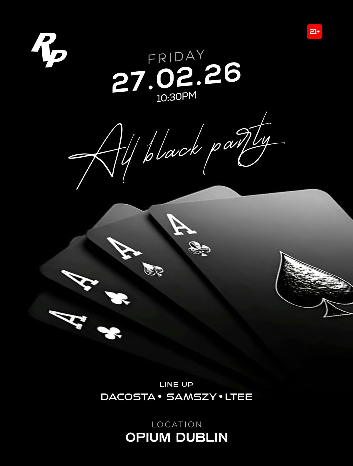 Welcome to the All Black Party happening at Opium on February 27, 2026 at 10:30 PM (GMT)! Get ready to dance the night away in your finest all-black attire. It's going to be a night to remember filled with great music, amazing vibes, and unforgettable moments. Don't miss out on this epic event - mark your calendars now!