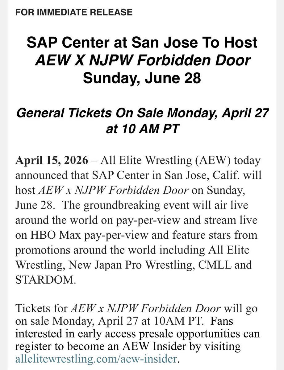 ✨ Embark on an extraordinary journey at All Elite Wrestling: Forbidden Door, where every moment promises to be unforgettable! 🌟 Imagine of transforming SAP Center in the heart of San Jose, CA into a realm of endless possibilities. 📅 Join us on June 27th, 2026 at 04:00 PM for an experience that will challenge your imagination and exceed your expectations. 🎯 This carefully curated event combines the finest elements of entertainment, innovation, and community spirit. Whether you're an adventure seeker, culture enthusiast, or someone looking for unique experiences, this event offers something special for everyone. 🎊 Don't miss this chance to be part of something extraordinary!http://maps.seatics.com/SAPCenter_WWE2023_2023-07-11_2023-10-02_0925_07112023_095229_SVGC_tn.png