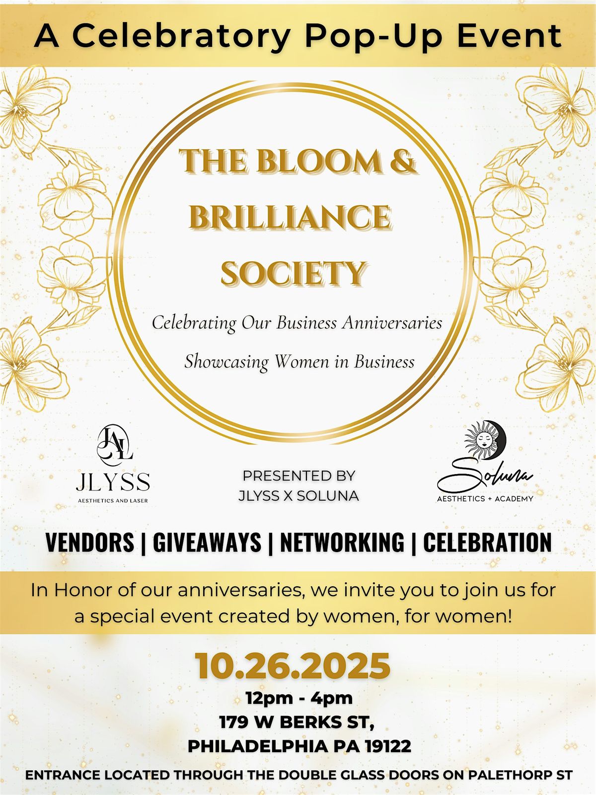 Join us for an unforgettable afternoon as we celebrate women in business, community, and collaboration. The Bloom & Brilliance Society Pop-Up is a luxe networking and shopping experience designed to highlight and support women-owned businesses in Philadelphia.