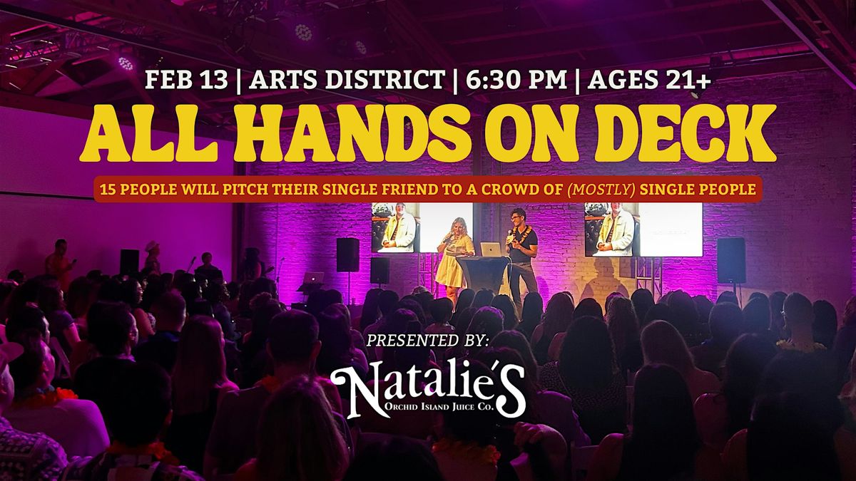 We handpicked 15 of LA’s most eligible singles and on Valentine’s Eve, they’ll be pitched live on stage to 250+ fellow singles in a one-night-only dating experience.Hosted by The Next Fun Thing with Natalie’s Juice, this special All Hands on Deck helps singles Find Their Main Squeeze (just in time for Valentine's day).