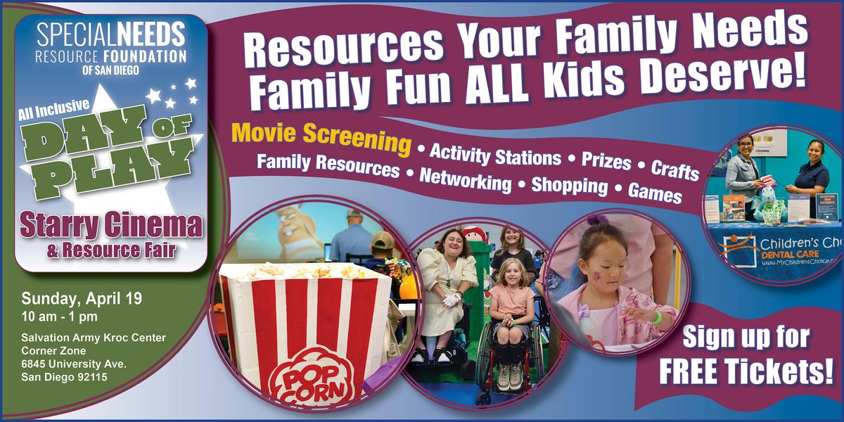 Join us for our Annual All-Inclusive Day of Play: Starry Cinema & Resource Fair on Sunday, April 19 from 10:00 AM to 1:00 PM at the Salvation Army Kroc Center Corner Zone – 6845 University Ave., San Diego, 92115.
