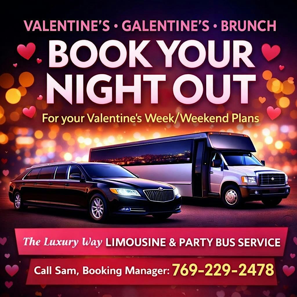 Are you seeking an opulent experience for Valentine's Day or Galentine's Day? The Luxury Way Party Bus & Limousine Services is currently accepting reservations for the following dates: Tuesday, February 10th , Thursday February 12th, Friday, February 13th, and Saturday, February 14th. Our all-inclusive luxury package, in collaboration with Phoenix Bar and Grill, offers a limousine ride, appetizers, an entrée, dessert, and a bottle for two.