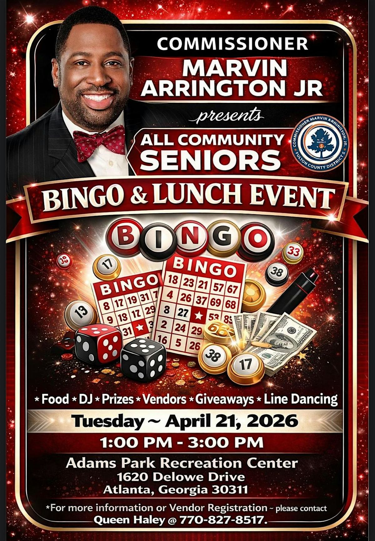 Join Commissioner Marvin Arrington Jr. for a fun-filled Bingo & Lunch event. An awesome opportunity to stay informed with community updates.