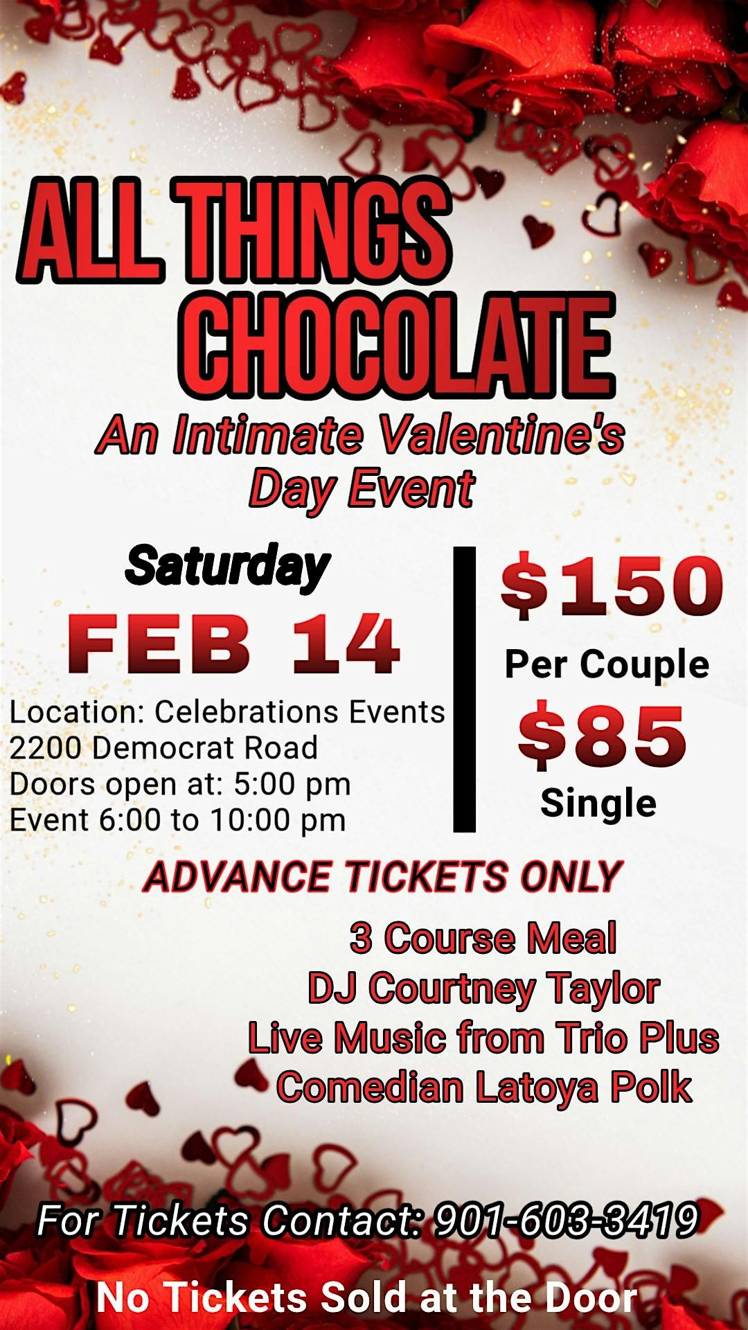 Looking for the ultimate Valentine’s Day experience? Join us for an intimate evening of Romance, Elegance, Laughter, Music and incredible food at All Things Chocolate an Intimate Valentine's Day. You are invited to experience a warm atmosphere. Whether you’re celebrating with your significant other or treating yourself, this is the place to be on February 14th. This night is all about savoring love, laughter, and unforgettable memories. Celebrate love, new love or self-love. This night is for Singles or Couples. Doors open at 5pm and the event starts at 6pm.