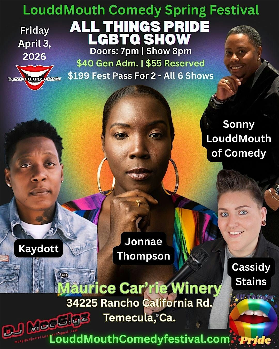 All Things Pride LGBTQ Show, a special theme comedy showcase & vendor market. Special Performances by: Comedians Jonnae Thompson, Kaydott and Cassidy Stains & Sonny the LouddMouth of Comedy &more special guest appearances. Part of proceeds benefit Temecula non profit Anthonie's Voice for Autism. Visit website for full lineup.This is the 3rd of 4 Days - 6 Shows - 3 Venues over 45+ comedians taking over wine country Temecula. A glass of champagne included with purchase. Laughter, Music, Food & Drinks & Whole Vibe!