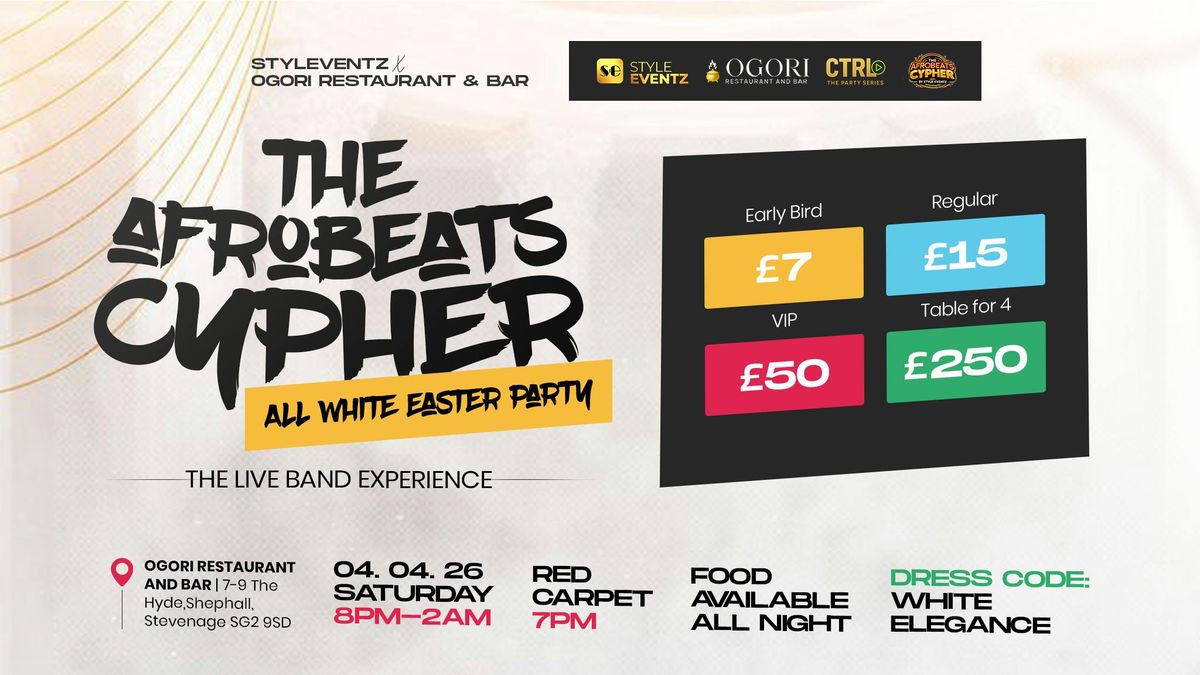 All White Easter Party ( The Afrobeats Cypher ) at Ogori Restaurant & Bar, Stevenage, Stevenage on 4th Apr 2026. Buy tickets in just 2-clicks with our super-fast checkoutDisclaimer: