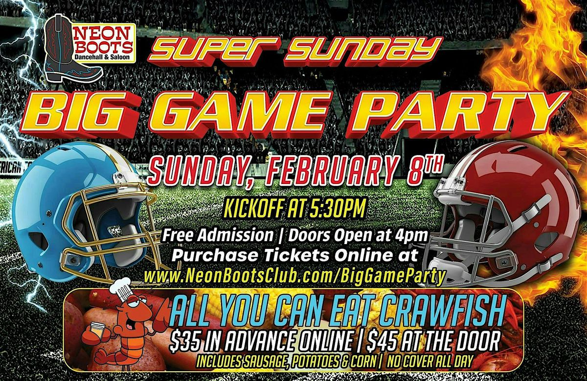 Get ALL-YOU-CAN-EAT CRAWFISH, Potatoes, Corn & more and enjoy the Super Bowl on Sunday, February 8th on multiple TV screens!About this Event