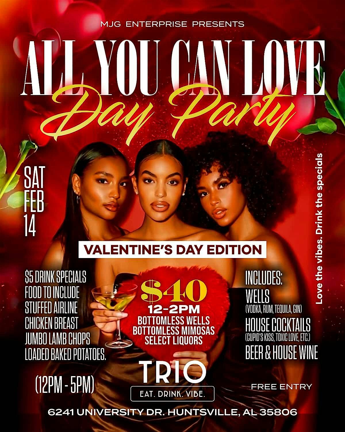 Celebrate Valentine’s Day the right way at Huntsville’s hottest daytime vibe. Whether you’re coming with your boo, your besties, or outside for yourself, the All You Can Love Day Party is bringing smooth R&B, hip-hop, cocktails flowing, and grown & sexy energy all afternoon.