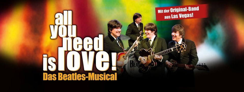 Das Erfolgs-Musical um die legendären Pilzköpfe kehrt zurück auf die Bühne!Die Erfolgs-Produktion erzählt die Geschichte der Beatles, angefangen von der Begleitband bis hin zum Weltruhm. 1960 schlossen sich vier junge Männer namens John, Paul, George und Ringo zu der Band „The Beatles“ zusammen. Es folgte ein Jahrzehnt, in dem die sogenannten „Fab Four“ Musikgeschichte schrieben und Hits für die Ewigkeit hinterließen. Bis heute sorgt ihre Musik noch weltweit für Euphorie. Die Musical-Biografie „all you need is love!” begeisterte bereits ein Millionenpublikum und bringt den Zauber dieser Zeit zurück auf die Bühnen in Deutschland, Österreich und der Schweiz.