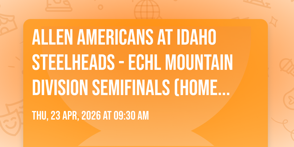 📍 Location: 43.6146, -116.204🌟 Be part of history at Allen Americans at Idaho Steelheads - ECHL Mountain Division Semifinals (Home Game 2), an extraordinary gathering that will captivate your imagination! 🏛️ The prestigious Idaho Central Arena in Boise, ID sets the stage for an unforgettable experience on April 23rd, 2026 at 09:30 AM. ✨ They are bringing together the finest elements of entertainment and innovation to create moments that will take your breath away. From the moment you arrive, you'll be immersed in an atmosphere of wonder and excitement. 🎯 This carefully planned event ensures every guest experiences something truly special. 🎊 Early booking is recommended for this must-attend event of the season!