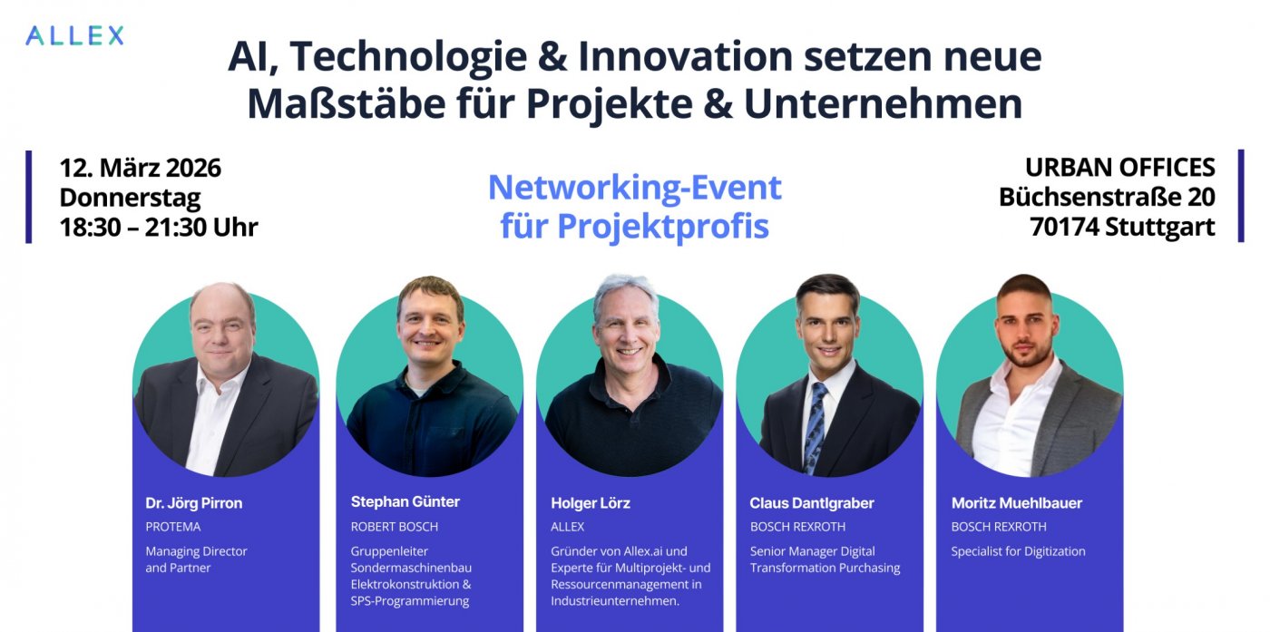 AI und Technologie setzen gerade neue Standards für Projektarbeit in der Industrie. Genau darüber sprechen wir bei unserem exklusiven Allex.ai Networking-Event in Stuttgart.