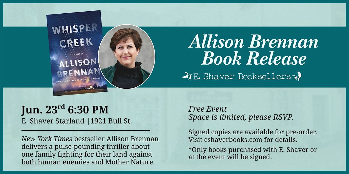 Brennan will be joining us for the debut of her new release with a talk followed by Q&A and signing. Beverages are for sale in The Gingerbread House event space. Books will be for sale. Only books bought through E.Shaver will be signed at the event.