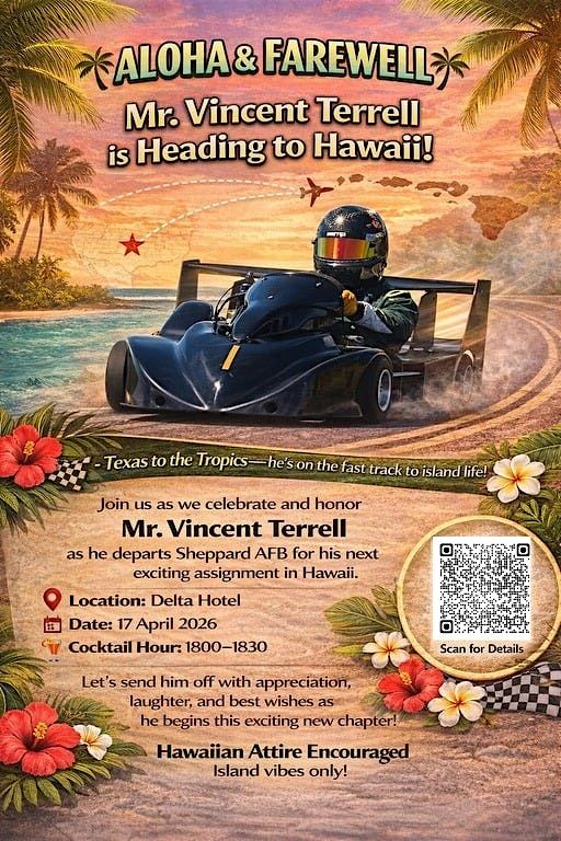 Join us in person to celebrate and say goodbye to Mr. Vincent Terrell as he embarks on an exciting new adventure in beautiful Hawaii! Let's gather for a fun and heartfelt send-off filled with laughter, stories, and good vibes. Don’t miss this chance to share some aloha spirit and wish him all the best!