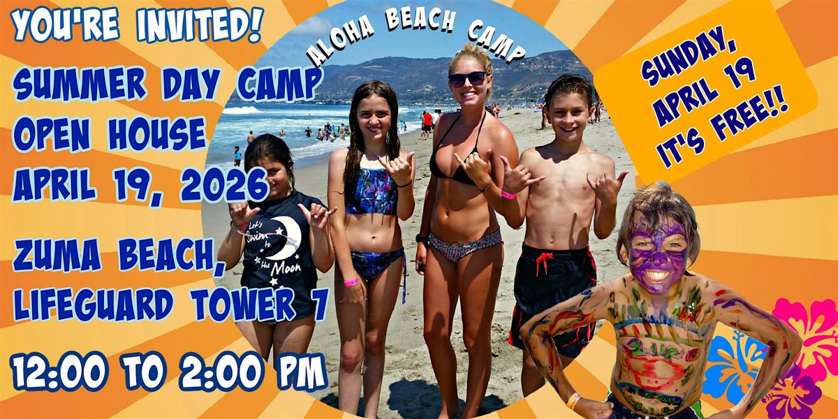 Aloha Beach Camp's Sunday, April 19 Open House will take place at Zuma Beach in Malibu, right on the beach at Lifeguard Tower 7. The Open House starts at 12pm and ends at 2:00 pm. Activities are ongoing, so you can arrive any time between those hours.