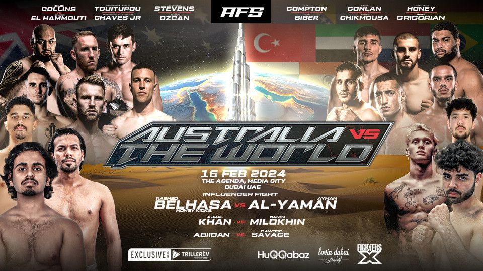 Australia vs The World, prepare for an unforgettable night as AFS lands in Dubai on February 16th, 2024. Bringing you elite K1 champions from across the globe, facing off with Australia’s greatest fighters. Does Australia have what it takes to come out on top?Featuring a new class of influencer boxing, Rashed Belhasa (@Moneykicks) vs Ayman Yaman (@Ayman_Yaman) for the ICB International Belt. Danya Milokhin (@Danya_Milokhin) will be battling it out against Ajmal Khan (@Ajmal_Khan_). And Davud Tirmizii (@Dawoodsavager) will be going head to head with Abdalla Ibrahim Mousa Ibrahim Almaazmi (@3biidaan).