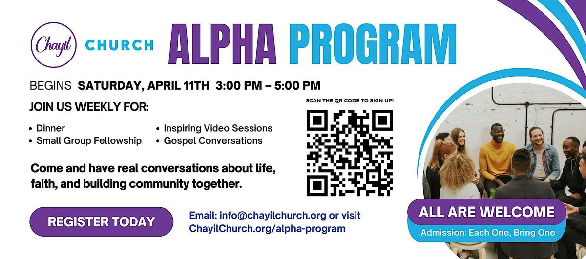 Alpha at Chayil Church: Dinner, video, and open conversations about life & faith. Starts April 11, 3–5 PM. All are welcome. Bring a friend