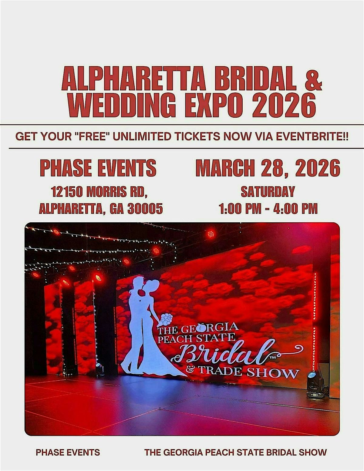 You are invited to be a guest at the Alpharetta Bridal & Wedding Expo 2026 sponsored by The Georgia Peach State Bridal Show. GET YOUR "FREE" UNLIMITED TICKETS NOW AND YOU WILL AUTOMATICALLY BE ENTERED TO WIN SOME COOL VALUABLE VENDOR GIVE-A-WAYS AND DOOR PRIZES. EACH BRIDE-TO-BE WILL RECEIVE A "COMPLIMENTARY" SWAG BAG FULL OF GOODIES UPON ENTRY. SAVE THE DATE for this highly anticipated event! It will take place on: