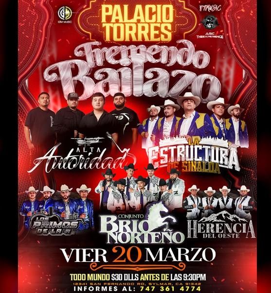 Don't miss ALTA AUTORIDAD, LA ESTRUCTURA DE SINALOA & MAS happening at Palacio Torres , San Fernando, CA, United States on 2026-03-20T21:30:00-08:00. A great evening with good music and a laid-back atmosphere awaits you. Invite your friends for a night out! **Event Details:** * **Location:** Palacio Torres , San Fernando, CA, United States Claim your ticket to be at the forefront of exciting innovation. #ALTAAUTORIDAD,LAESTRUCTURADESINALOA&MAS #event #exciting #San FernandoEvents #CAEvents
