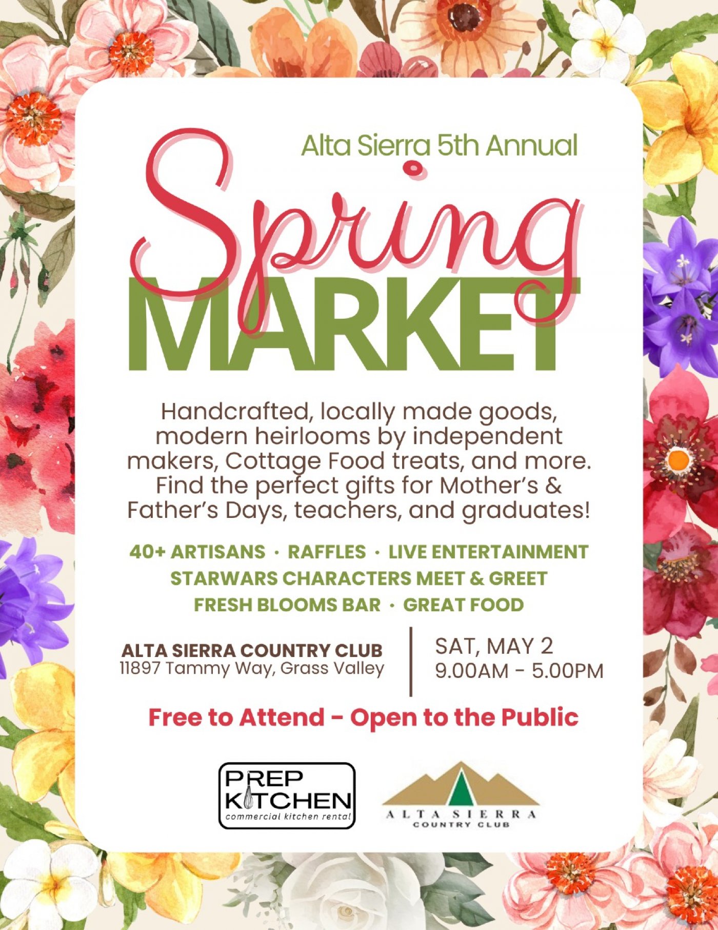 We're thrilled to be back with our Spring Market at the Alta Sierra Country Club! Come visit us for a day of shopping for your moms, dads, teachers, grads, and more! Stay for the entertainment, a build-a-bar blooms bouquet, grab a bite, and support our local craftpreneurs!