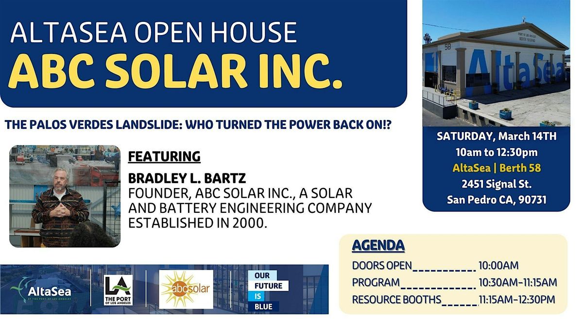 Join us for a compelling talk by clean-energy pioneer Bradley L. Bartz, who will share the true story behind the Palos Verdes landslide and the unexpected solution that helped restore power when traditional systems failed. Using distributed solar and battery technology, Bartz and his team delivered emergency power under extreme conditions—an effort that ultimately sparked a new generation of mobile energy systems now operating at AltaSea, and a bold vision for floating energy solutions in Los Angeles Harbor.