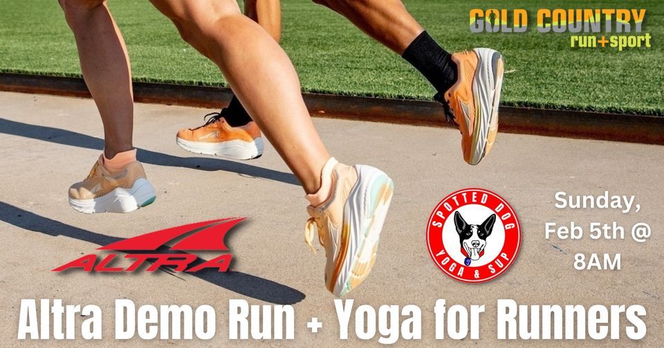Join us for a Demo Run with Altra followed by a Yoga for Runners class taught by Spotted Dog Yoga on Sunday, February 5th at 8AM at our Running Outlet Center in Folsom!These incredible back-to-back events, centered around foot health, balance and running for health & longevity, are complimentary and open to everyone. We will start with a fun demo run at 8AM on the Johnny Cash trail, where runners can try out the all new Via Olympus, Altra’s new max-cushion road shoe. The run will be immediately followed by a special Yoga for Runners class led by Spotted Dog Yoga. The class will be held inside the store, and Yoga mats will be provided.