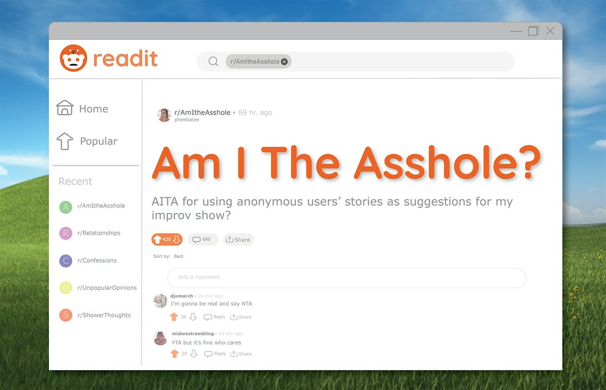 Am I The Asshole is a St. Louis based improv show inspired by your favorite life advice subreddits. Our cast will pull from “real” Reddit stories (found on forums such as r/AmITheAsshole, r/Relationships, etc.) to explore the relationships and baffling internal logic of various chronically online strangers. Join us, comment, upvote?