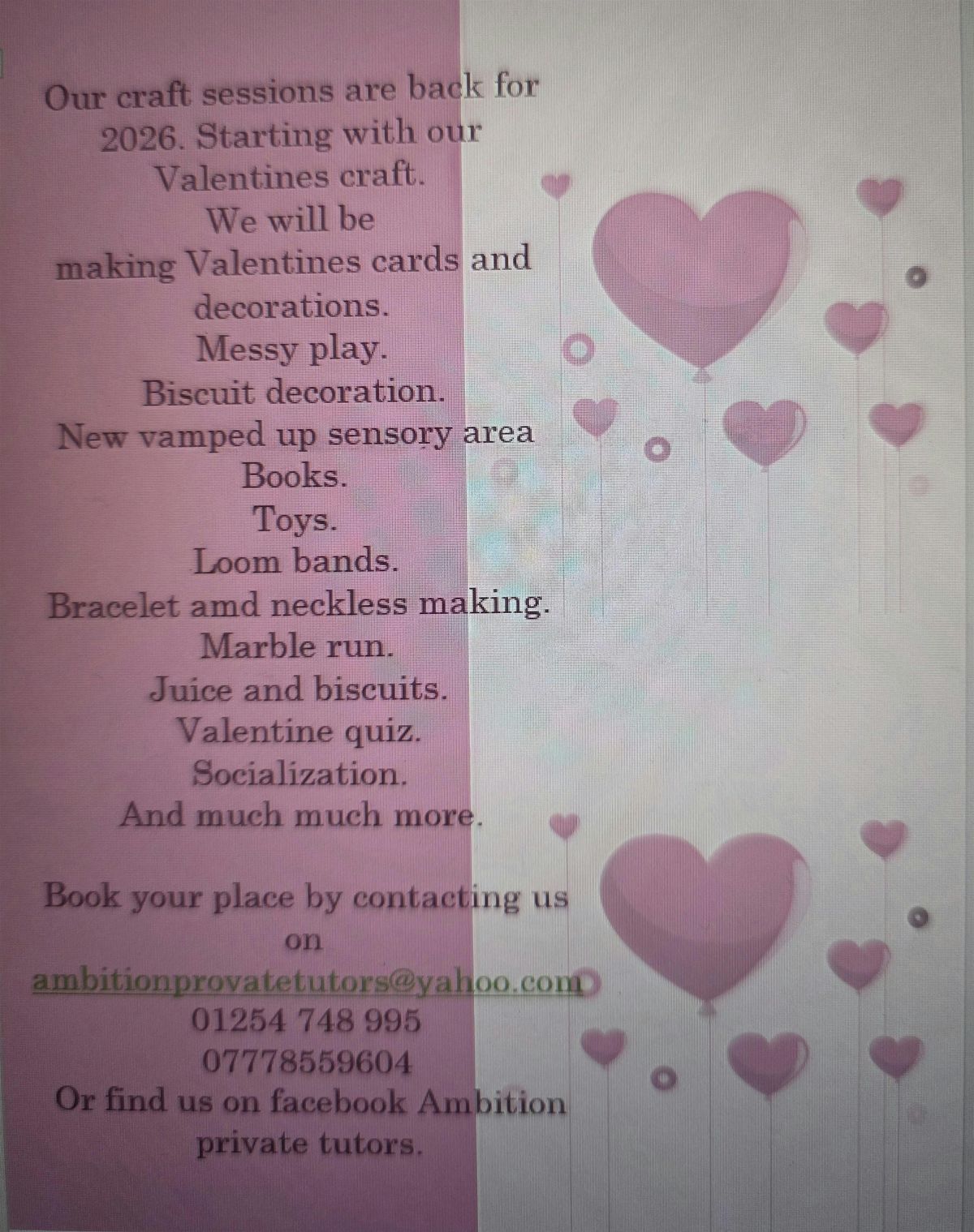 We will be making Valentine's cards and decorations. Loom bands. Bracelets and necklaces, biscuit decorating, toys books, messy play and sensory area.