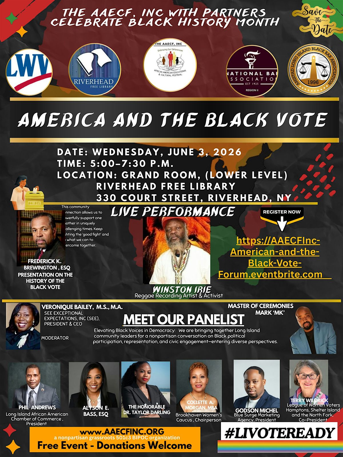 Riverhead, NY — A nonpartisan forum titled “America and the Black Vote” will be held Wednesday, June 3rd at 5 p.m. at the Riverhead Free Library, bringing together civic leaders, attorneys, and advocates to discuss Black political participation and its impact on American democracy.