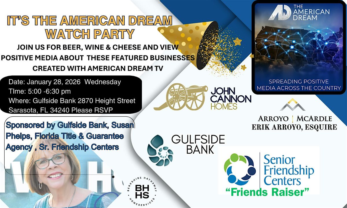 Join us for a Gulfside Bank "Launch" for their 2026 HOME GROWN Campaign. We’ll be premiering uplifting American Dream TV segments from 2025 while enjoying wine, beer, and light bites — a feel‑good evening dedicated to community, connection, and positive storytelling. Join us for a special “Friends” Raiser as we celebrate Sarasota’s local businesses and support Senior Friendship Centers.
