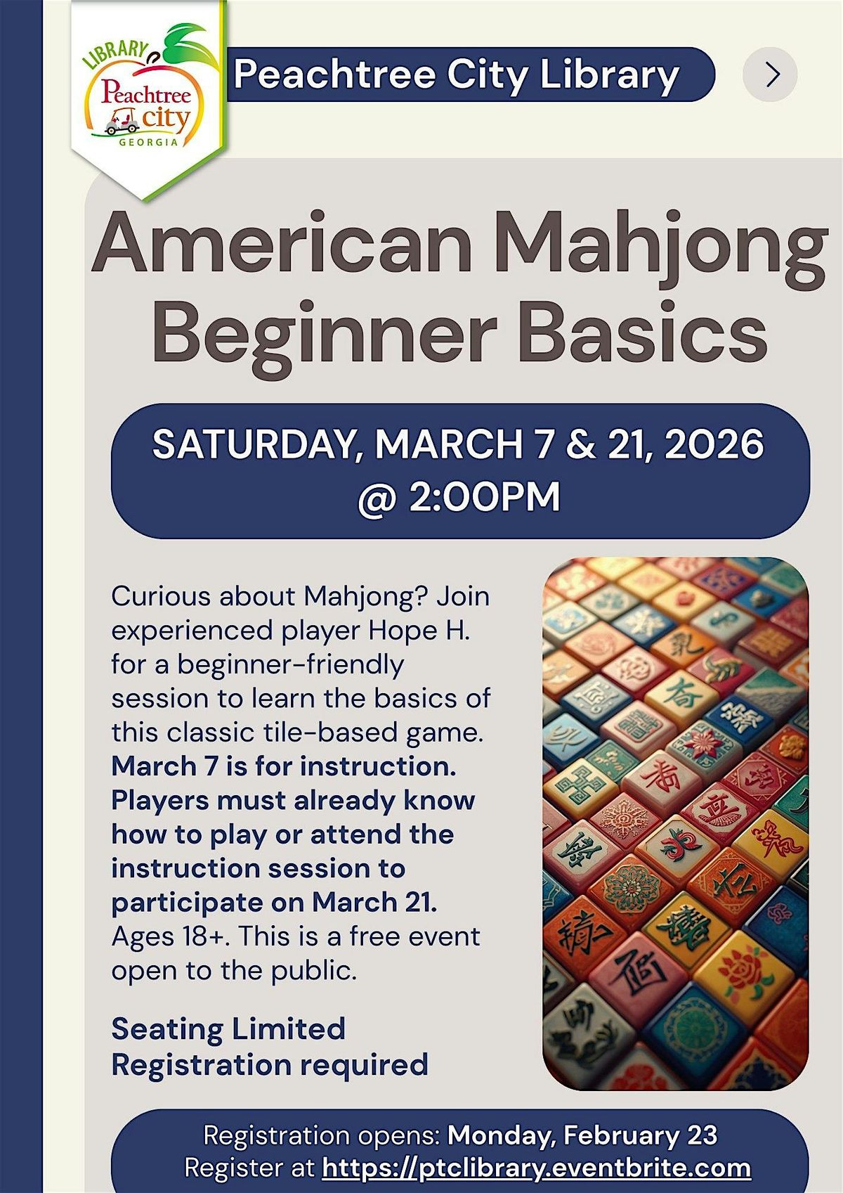 Curious about Mahjong? Join experienced player Hope H. for a beginner-friendly session and learn the basics of this classic tile-based game. This is a free event open to the public. Ages 18+. Registration is required.