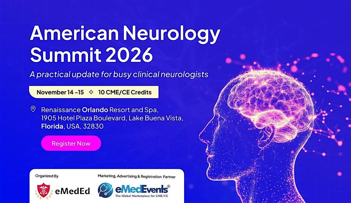 The 4th Annual American Neurology Summit (ANS) 2026, organized by eMedEd and supported by eMedEvents as the official partner for marketing, advertising, and registration, will take place on November 14–15, 2026, in Orlando, Florida. This CME/CE-accredited hybrid conference offers both in-person and virtual participation. ANS 2026 will feature expert-led sessions, interactive case-based discussions, and structured networking opportunities. Tailored to meet the evolving needs of neurologists and other healthcare professionals, the summit offers a collaborative platform to explore the latest advancements in neurology. Attendees will gain insights into enhancing their clinical practice and learn about innovations in research and technology in the rapidly evolving neurology landscape, all designed to improve patient outcomes.