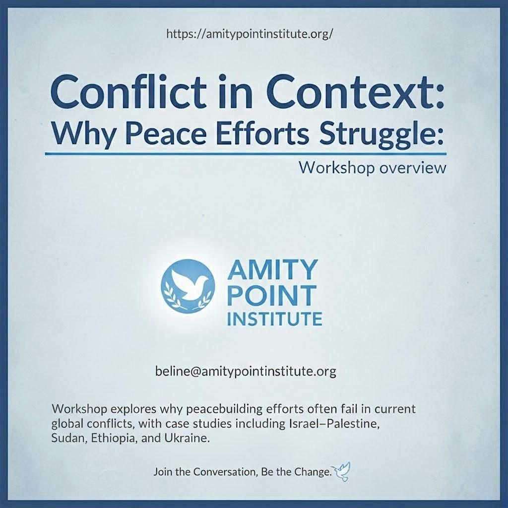 This AmityPoint workshop creates a shared space for participants to critically examine why peace efforts struggle in contemporary conflicts and what this reveals about the assumptions, trade-offs, and power dynamics shaping peace processes today.